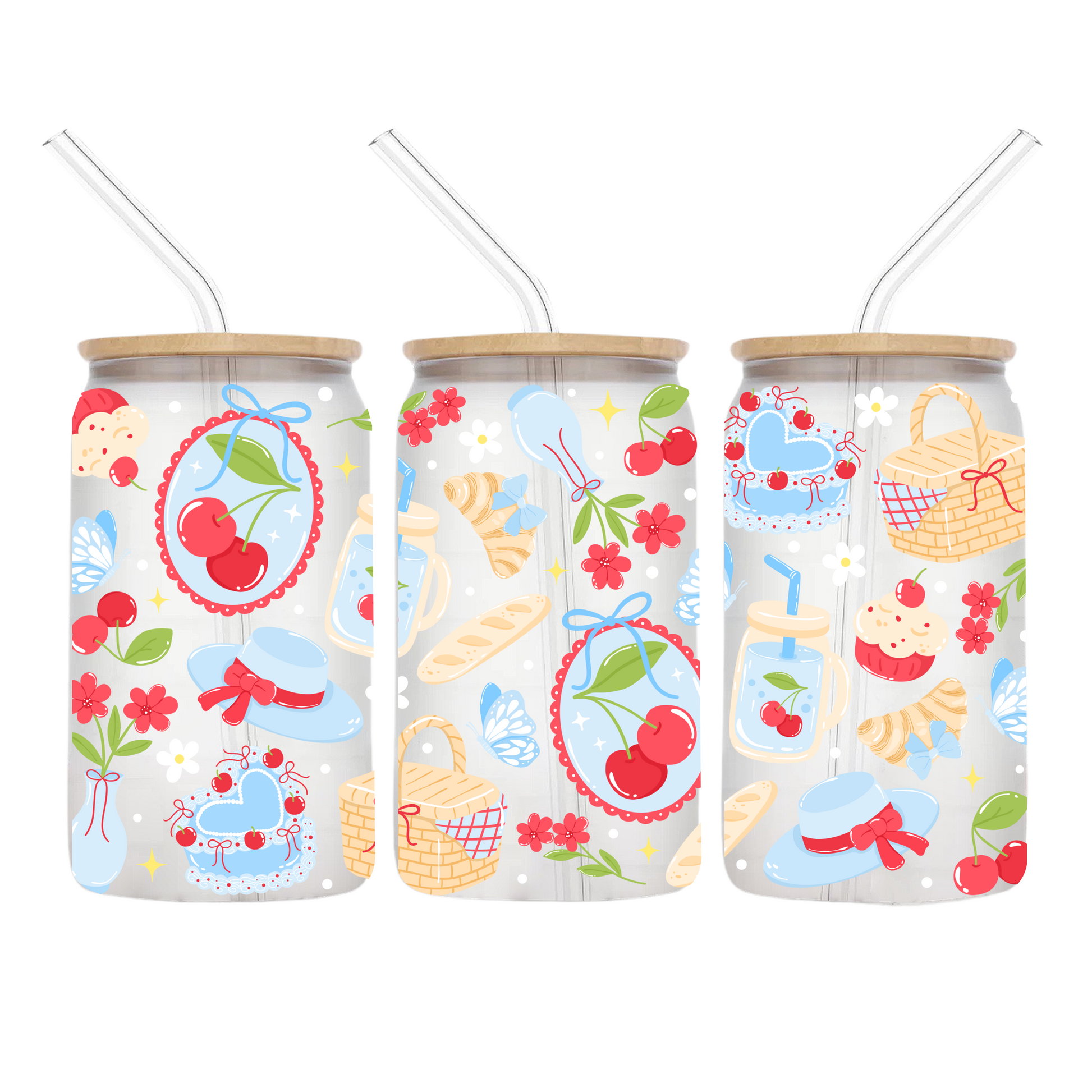 Sip in style with one of our Cherry Picnic glass cups! Each cup comes with a Bamboo Lid & Glass Straw.