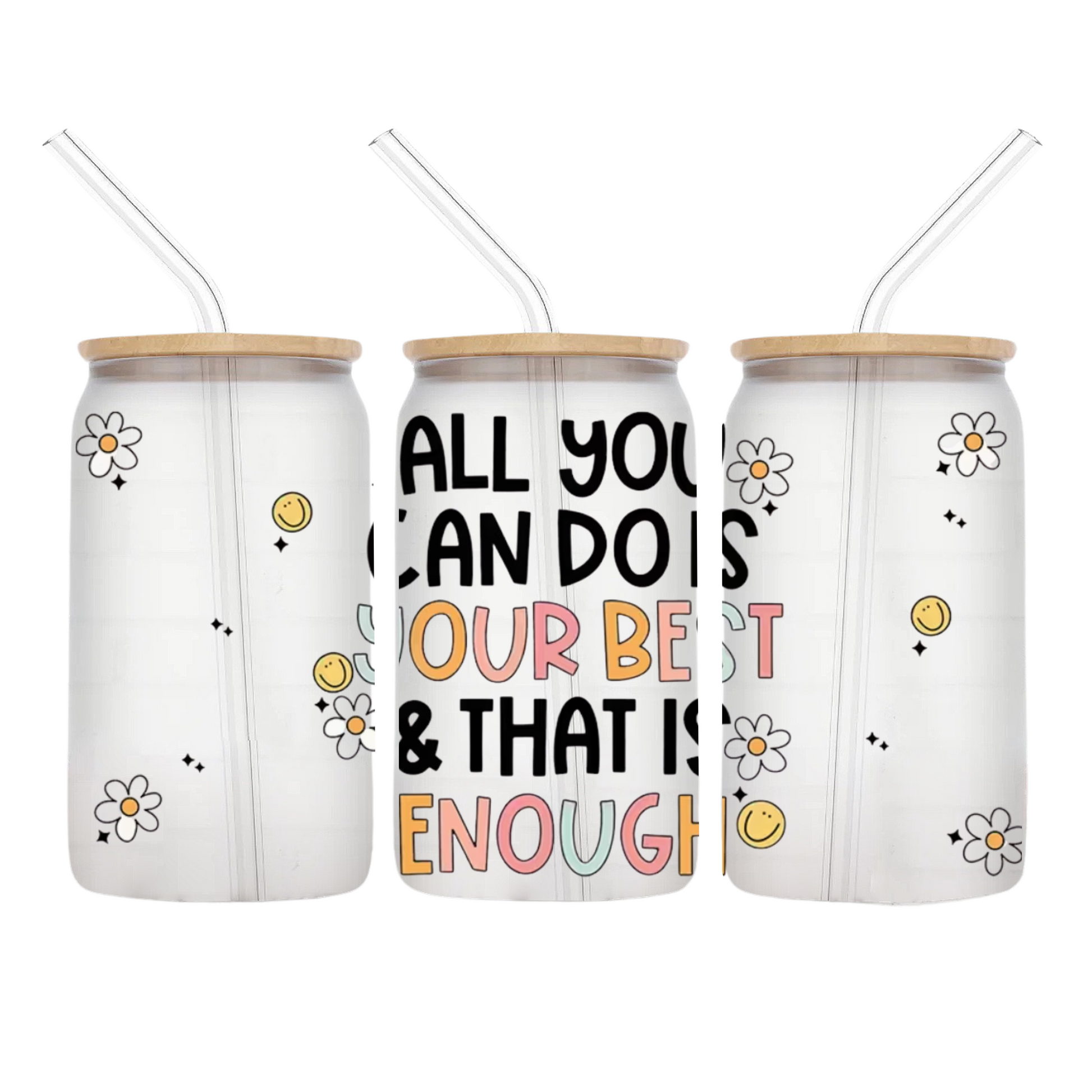 Sip in style with one of our Your Best is Enough glass cups! Each cup comes with a Bamboo Lid & Glass Straw.